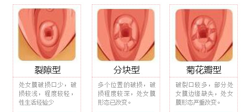 医生介绍说,处女膜破损分为三型:裂隙型、分块型和菊花瓣型。对于需要做处女膜修复手术的女性来说,术前通常需要做个妇检查看一下具体情况,之后才能根据实际情况,来针对性的安排手术。
