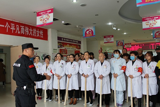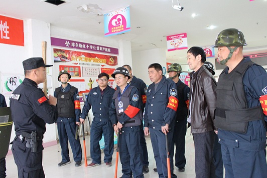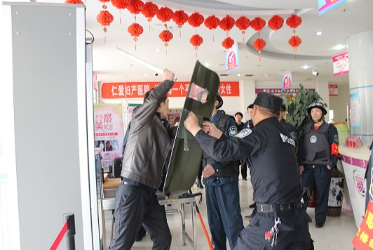 3月10号16时,一楼导医台警报突然响起,2名“暴徒”持棍棒,冲进医院,欲袭击工作人员,安保人员立即启动应急处置预案,各科室备勤人员手持警棍在一分钟内到达了集合地点,并采取有效措施将1名暴徒制服,将负隅顽抗的一名“暴徒”当场击毙,最后现场得到了有效控制。